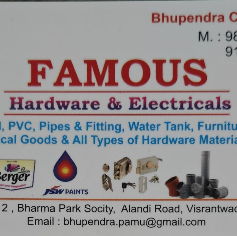 Famous Hardware & Electricals is averified professional service provider on DemandToKaro. Specializing in Hardware & Plywood, Famous Hardware & Electricals is ready to provide exceptional service and build a strong reputation on our platform.